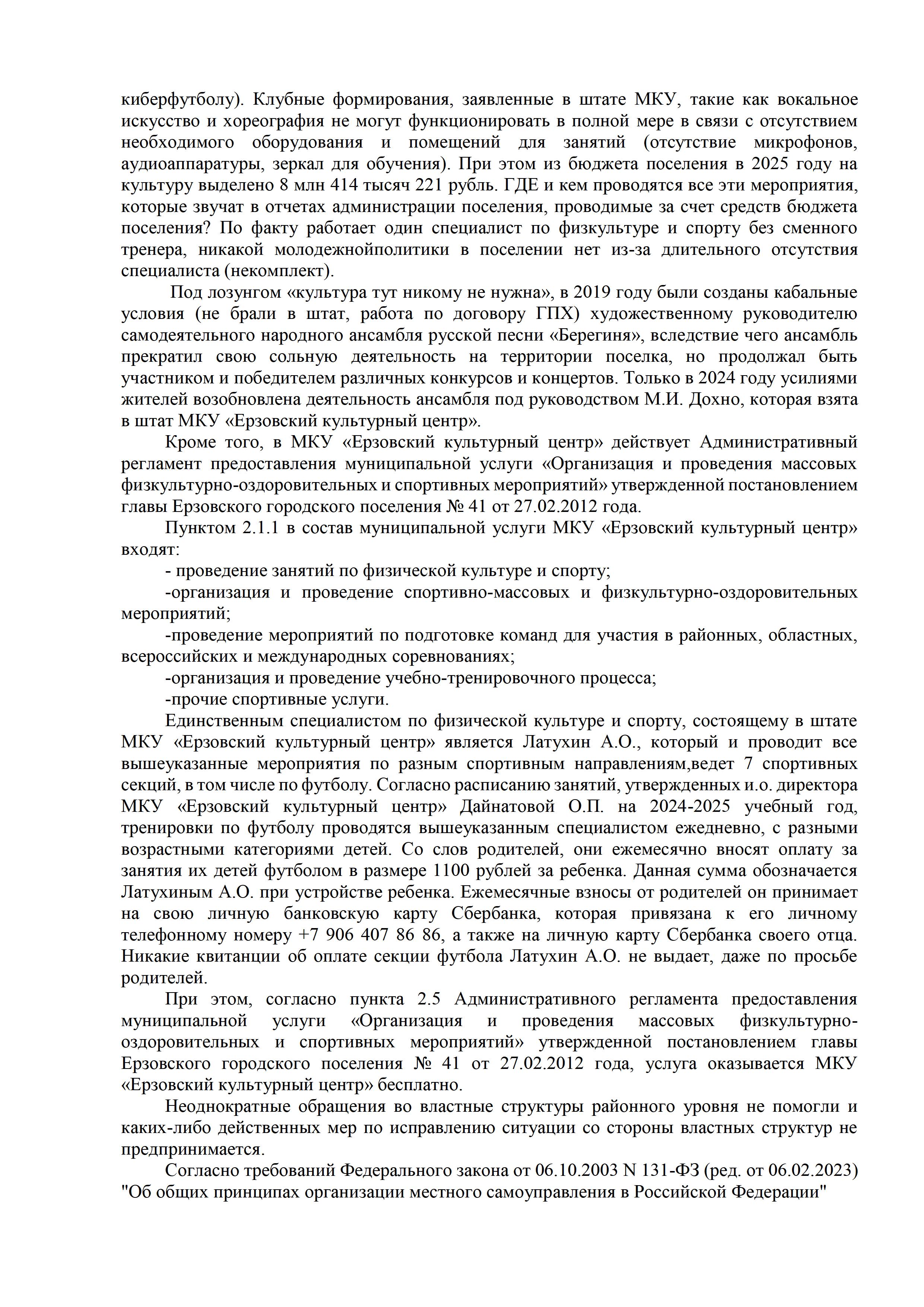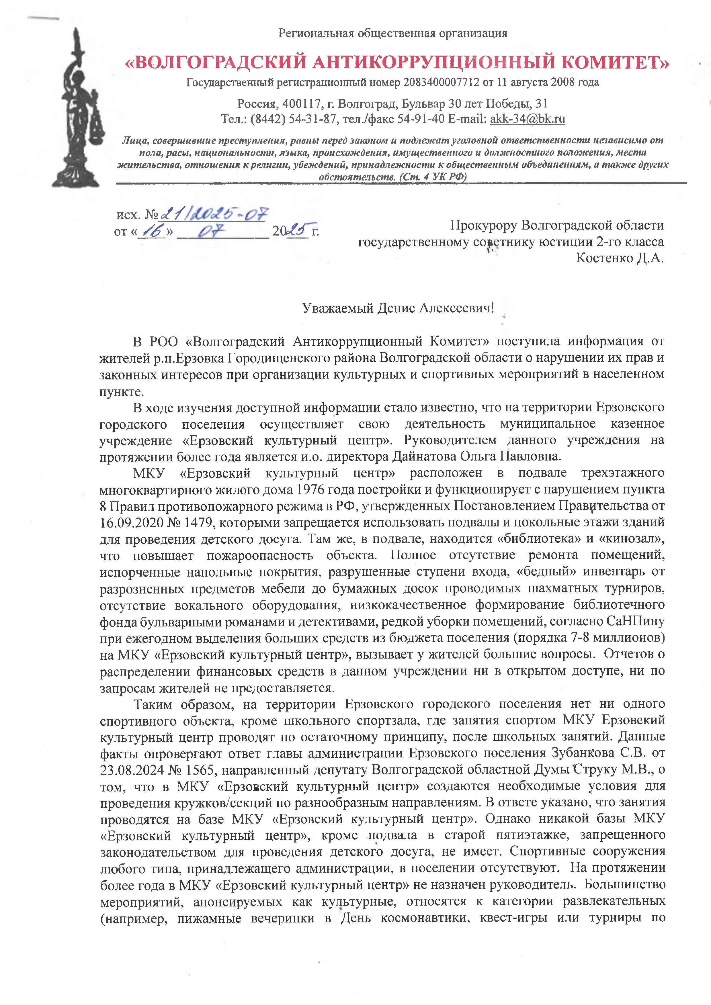 Председателем совета РОО «ВАК» направлено обращение в органы надзора по ситуации в р.п. Ерзовка Городищенского района нашего региона где допускается неэффективное расходование бюджетных средств, выделяемых на развитие сферы спорта и культуры. Вопрос держим на контроле. Подробнее: