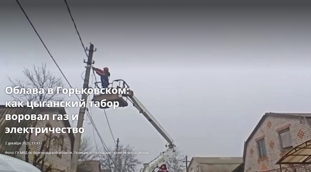 Совместная операция полиции, Управления Федеральной службы безопасности (УФСБ) и представителей коммунальных служб прошла в цыганском поселке Горьковский, расположенном в Советском районе Волгограда. Мероприятие проводилось при активной поддержке бойцов Росгвардии. Подробнее: https://novostivolgograda.ru/news/2025-12-02/oblava-v-gorkovskom-kak-tsyganskiy-tabor-voroval-gaz-i-elektrichestvo-5516586
